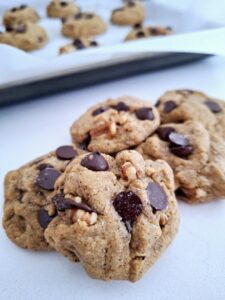 Dans un bol, mélanger l’huile, le sirop d’érable, la vanille et la cassonade ou sucre de coco jusqu’à ce que le mélange soit complètement lisse. Ajouter les farines, la poudre à pâte et le sel, et mélanger jusqu’à ce que la farine soit bien incorporée (ne pas trop mélanger). Incorporer les capuchons de chocolat et les noix hachées, et déposer des cuillères à soupe de pâte sur les plaques, en les espaçant légèrement (ne pas les aplatir).
