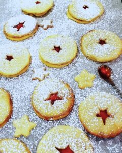 Montage: Sur le dessus des biscuits pleins, étendre 1 cu. à thé de confiture. Saupoudrer les biscuits évidés du sucre glace et les déposer sur les biscuits garnis de confiture, le côté sucré au-dessus. Presser délicatement. Conserver dans une boite hermétique.