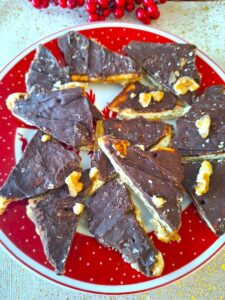 Ajouter des noix hachées, sur le dessus, si désiré. Mettre la plaque au réfrigérateur pour laisser le caramel durcir, au moins 30 minutes. Casser des morceaux en suivant les biscuits sodas, et avec un couteau, couper chaque biscuit en deux triangles. Les conserver dans une boîte hermétique au réfrigérateur, en séparant chaque étage de papier parchemin.