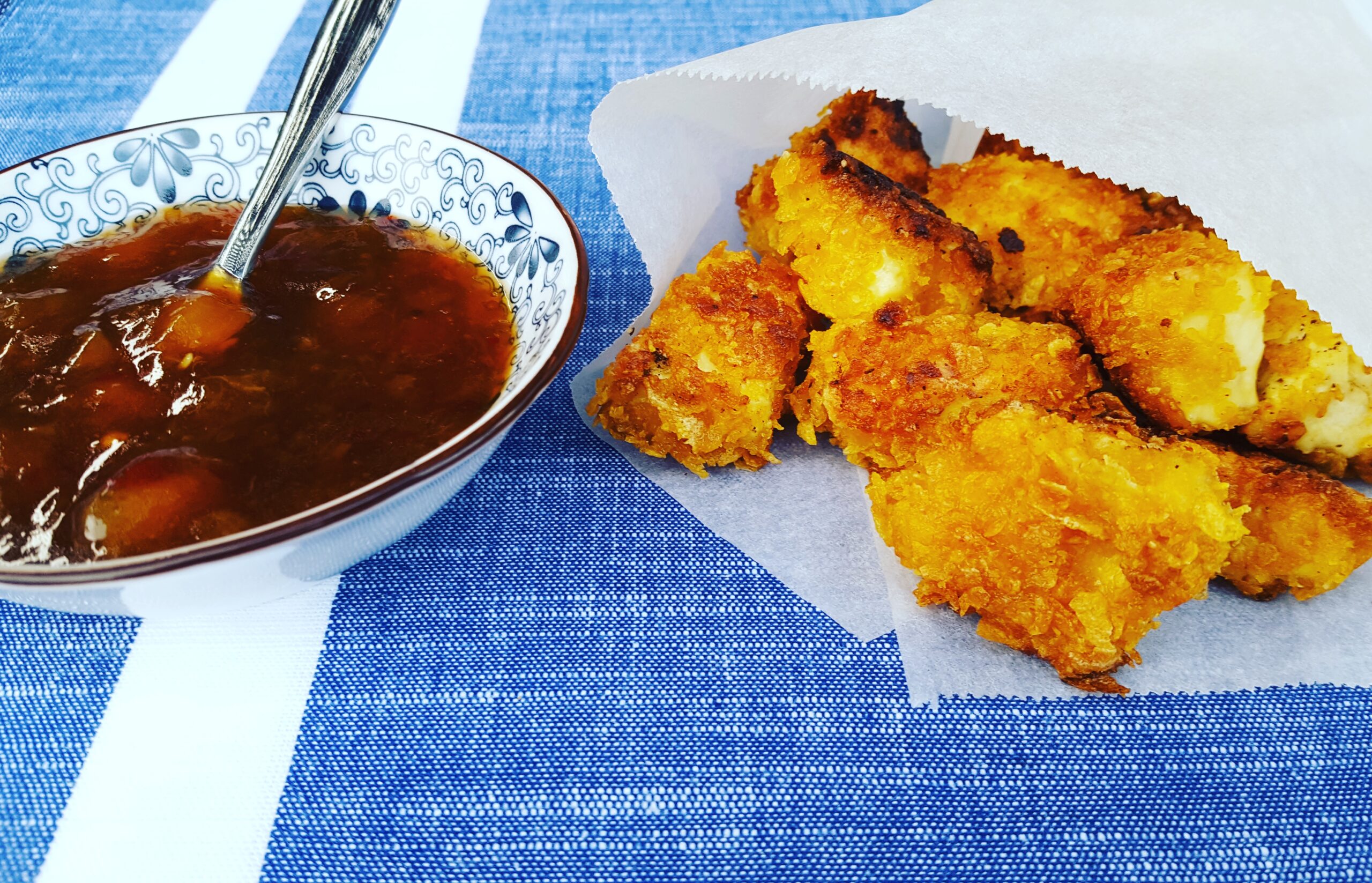 Doigts de poulet croustillants, sauce moutarde au miel, avec salade de chou crémeuse