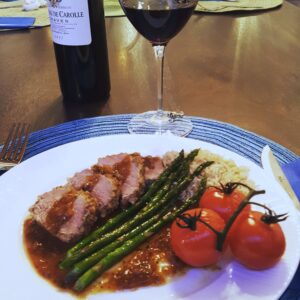 Couper les filets de porc en tranches fines. Servir avec la sauce, des asperges grillées et des tomates en grappes grillées.