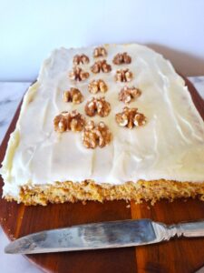 Démouler le gâteau sur une grille et laisser refroidir complètement avant d’ajouter le crémage. Garnir de quelques noix de Grenoble si désiré, et réfrigérer 1 à 2 heures avant de trancher.