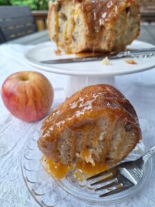 Renverser le gâteau encore tiède sur une assiette de service, et verser un peu de sauce au caramel sur le dessus, en laissant couler sur les côtés. Trancher le gâteau et verser un peu de sauce au caramel sur chaque morceau.