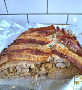 Pain de viande au poulet farci aux champignons et fromage, entouré de bacon