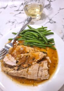 Pour le service, trancher la poitrine de dinde en diagonale (sera plus tendre), et servir avec la sauce, sur du riz avec des haricots.