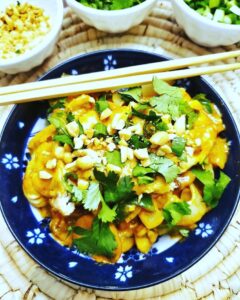 Dans un grand bol, préparer la sauce: mélanger le beurre d’arachide et l’eau tiède avec un fouet quelques secondes. Ajouter le lait de coco, la sauce soya, la sauce de poisson, la pâte de cari rouge si désiré, l’huile de sésame, le miel, le jus de lime, la Sriracha et la fécule de mais. Bien mélanger avec un fouet. Réserver.