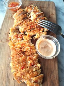 Préparer trois assiettes : une avec la farine, une avec les œufs battus et une avec la chapelure panko mélangée aux graines de sésame. Enrober les morceaux de poulet dans la farine, puis les œufs, puis la chapelure.